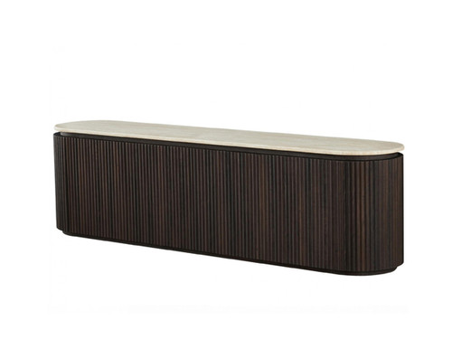 The Crete range blends organic textures with modern design, creating a collection that feels both timeless and contemporary. Each piece is topped with matte travertine artificial marble, offering a sophisticated stone look with everyday durability. The body and frame are crafted from corrugated MDF in an espresso finish, adding warmth and elegance. With its soft curves and versatile forms, the Crete Dining range brings harmony and understated luxury to living and dining interiors.